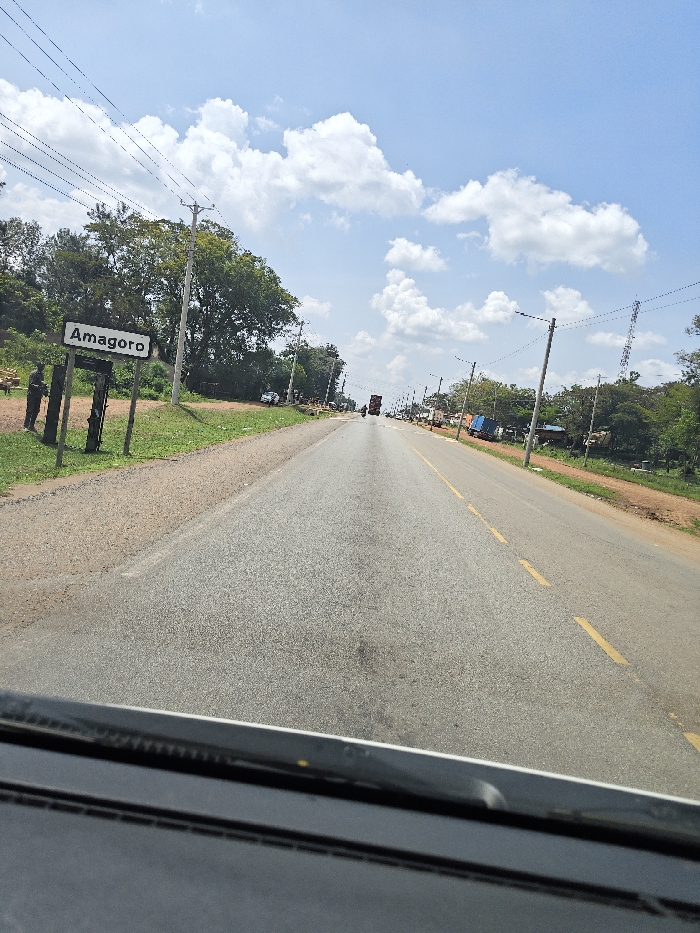 A road stretches ahead under a partly cloudy sky, marked with intermittent yellow lines. A road sign indicating "Amagoro" stands to the left, near figures standing on the roadside. Utility poles line the route, and vehicles are visible further along the road, suggesting a populated area. The view is from within a vehicle, focusing on the road ahead.