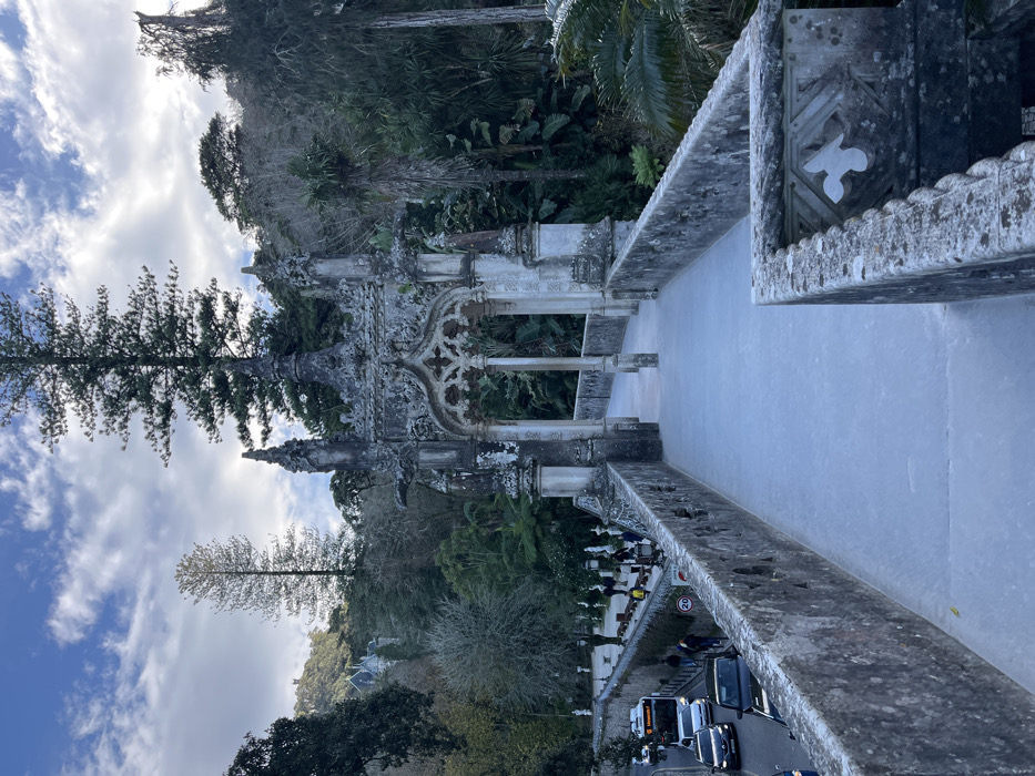 A historic, ornate stone structure with arches and columns stands amidst lush greenery, framed by a bright sky with scattered clouds. The structure overlooks a road with parked vehicles. A raised walkway with detailed stone railings runs parallel. The architecture is aged, possibly from a castle or palace. Tall trees punctuate the landscape, contributing to a vibrant and diverse natural backdrop.