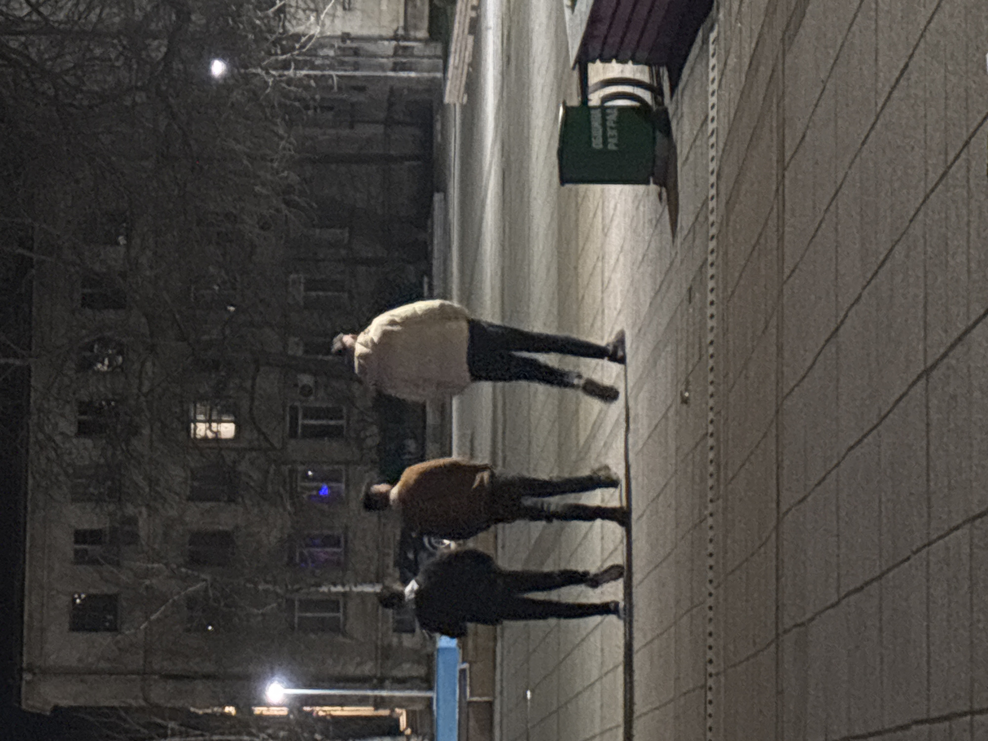 An outdoor nighttime scene is depicted on a paved plaza or street in Razgrad, Bulgaria. The location is confirmed by the Cyrillic inscription "ОБЩИНА РАЗГРАД" (Municipality of Razgrad) on a green cylindrical waste receptacle located in the mid-right foreground. Three adult males are observed from behind, walking from left to right across the frame, away from the viewer. The leftmost individual wears a dark jacket, dark trousers, and light-colored athletic shoes. The central individual wears a brown or rust-colored jacket, dark trousers, and dark shoes. The rightmost individual wears a light beige or cream-colored hooded puffer jacket, dark trousers, and dark shoes. All three individuals are positioned roughly abreast, suggesting they are walking together. The ground is composed of light-colored paving stones or tiles, illuminated by artificial light sources. To the right of the individuals, a low, elongated structure constructed with reddish-brown planks, possibly a bench or planter, is visible. To the left, a light blue, rectangular concrete structure, potentially an empty fountain or large planter, is present. In the background, a multi-story building with numerous windows, some of which are illuminated, stands behind a sparse arrangement of bare deciduous trees. Two streetlights with glowing fixtures are visible: one on the left side of the frame and another further back on the right. A dark vehicle is partially discernible behind the central walking individual. The scene is illuminated by artificial light, characteristic of an urban environment after dusk, and the bare trees indicate a season outside of summer.