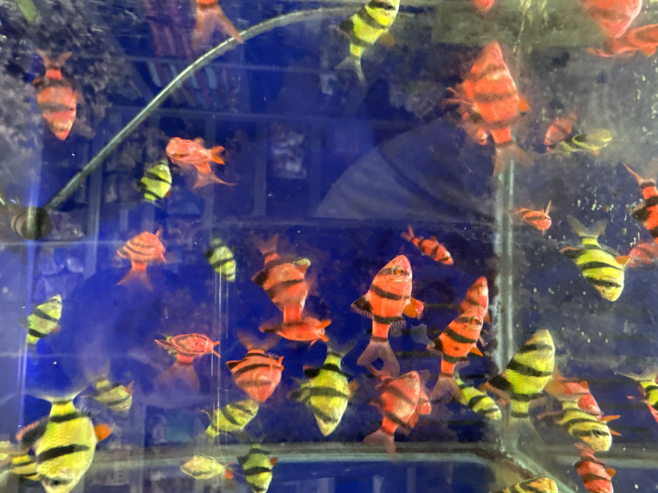 This image depicts a glass aquarium filled with freshwater fish, located in Kfar Saba, Israel