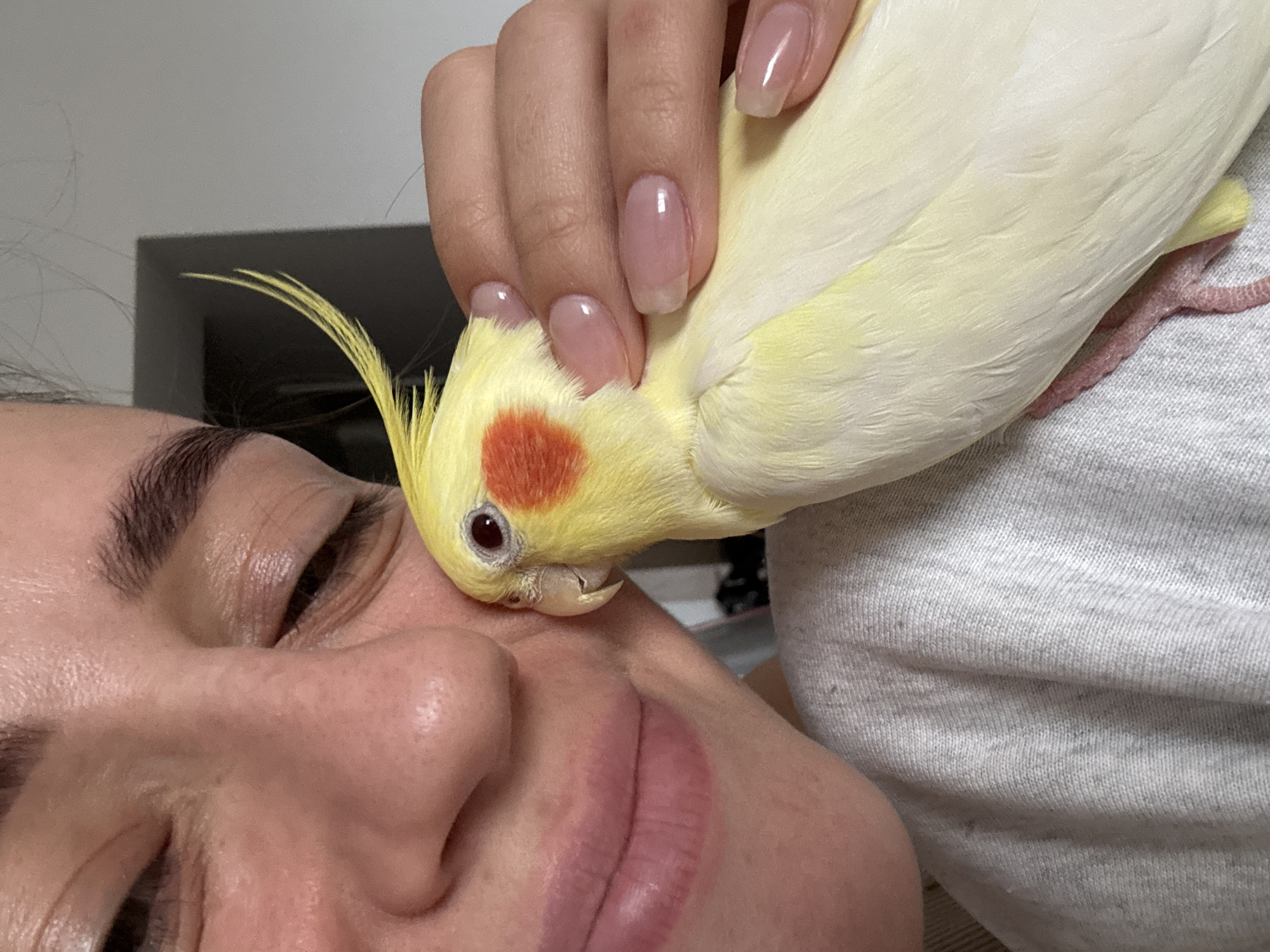 A close-up image shows a woman's face as a yellow cockatiel is nestled against her cheek
