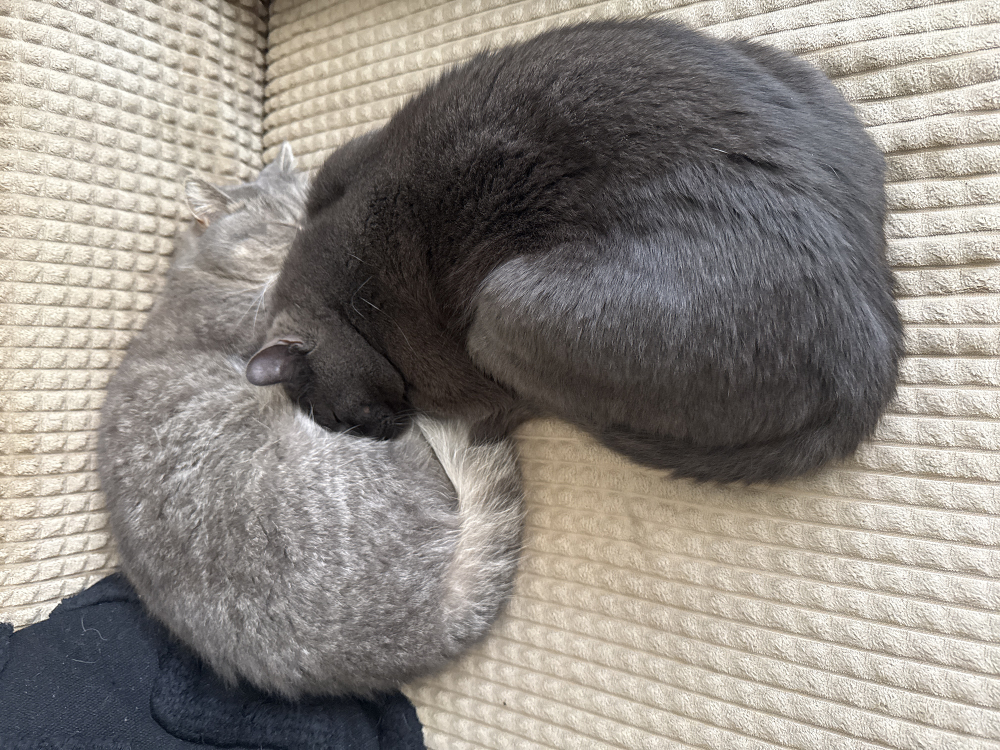 Two domestic cats are observed sleeping on a light beige, corduroy-textured sofa or couch. The scene is located in the city of Marchaevo, Bulgaria. One cat, a light grey tabby, is curled into a tight ball, positioned towards the top left of the frame, with its head tucked under its body. Adjacent to it, slightly overlapping and in the lower half of the frame, lies a second cat with dark grey fur, also curled into a ball, facing towards the lighter grey cat. Both animals appear to be at rest. A folded black fabric item is partially visible in the upper left corner of the image, behind the lighter grey cat. The lighting is ambient and even, illuminating the textured fabric and the cats' fur.