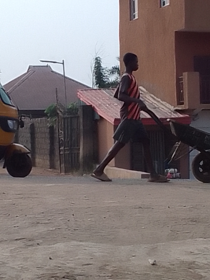 - "In Nkwelle Ezunaka, Nigeria, a young individual is observed in a side profile view, walking from right to left across an unpaved, dusty road surface, pushing a dark-colored wheelbarrow" by FM-5Fe3Y2, licensed under CC BY 4.0
