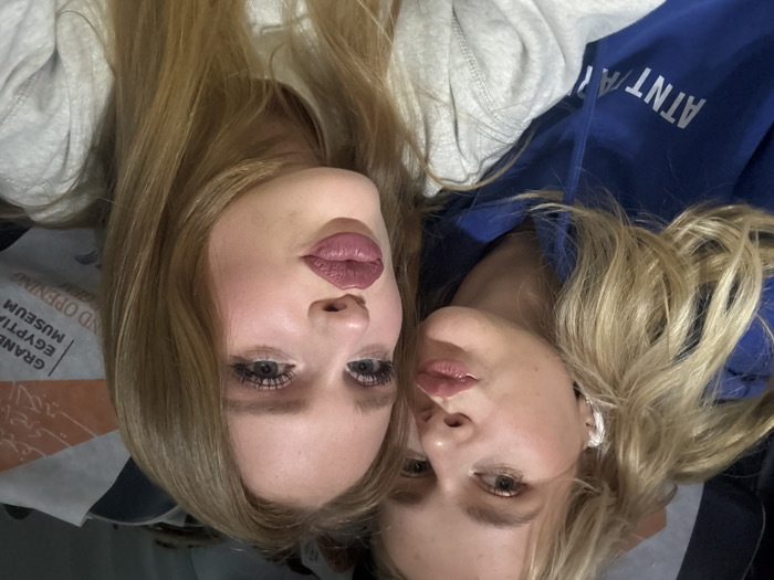 Two Caucasian females, appearing to be young adults with blonde hair, are depicted in a close-up, indoor setting within the city of Unknown, Unknown