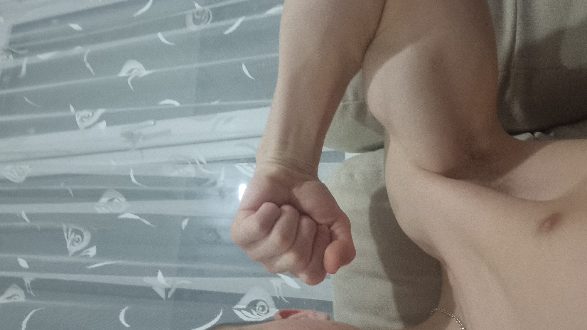 The scene captures a close-up, partial view of an individual's upper body in an indoor setting. The light-skinned individual is shirtless, revealing their right chest and shoulder. A silver-colored chain necklace is visible around the left side of the neck. The individual's right arm is flexed, displaying the bicep, with the right hand clenched into a fist. Light-colored hair is present in the right armpit. The subject is positioned against a light beige or light brown upholstered furniture piece, consistent with a sofa or chair. The background features a window covered by vertically pleated white sheer curtains. These curtains are adorned with a repeating pattern of white, abstract, curved, and leaf-like designs. The precise location within Pchelnik, Bulgaria, cannot be determined from the visual information provided, but the environment is consistent with a private residence or similar indoor space.