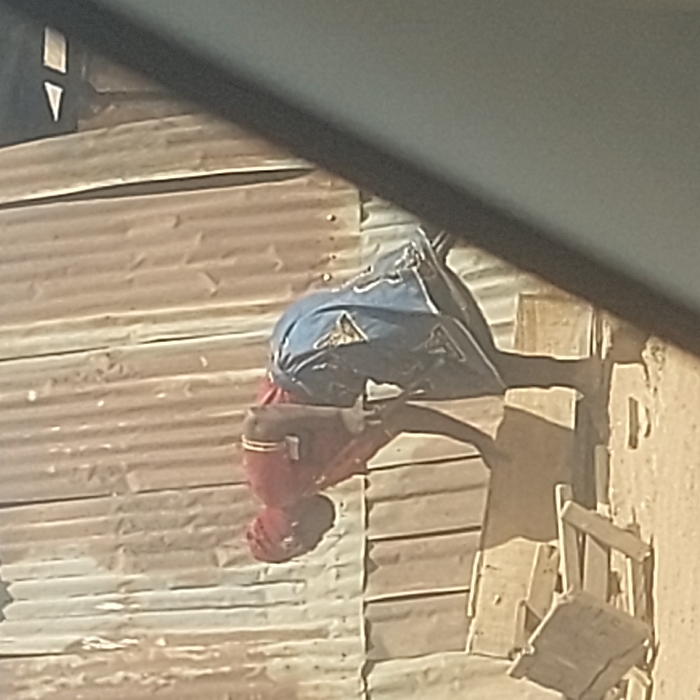The image depicts an outdoor scene in Kuru Dungus, Nigeria, under bright sunlight. An adult female, barefoot, is shown leaning forward at the waist. She wears a red short-sleeved top, a blue skirt with white patterns, and a red head covering. Her right hand is extended downwards, positioned over a rectangular wooden container on the dirt ground. To the left of this container, several wooden planks or disassembled crates are stacked. The background consists of a corrugated metal wall. The lower right portion of the frame is obscured by a dark, angled structure, consistent with a vehicle's interior.