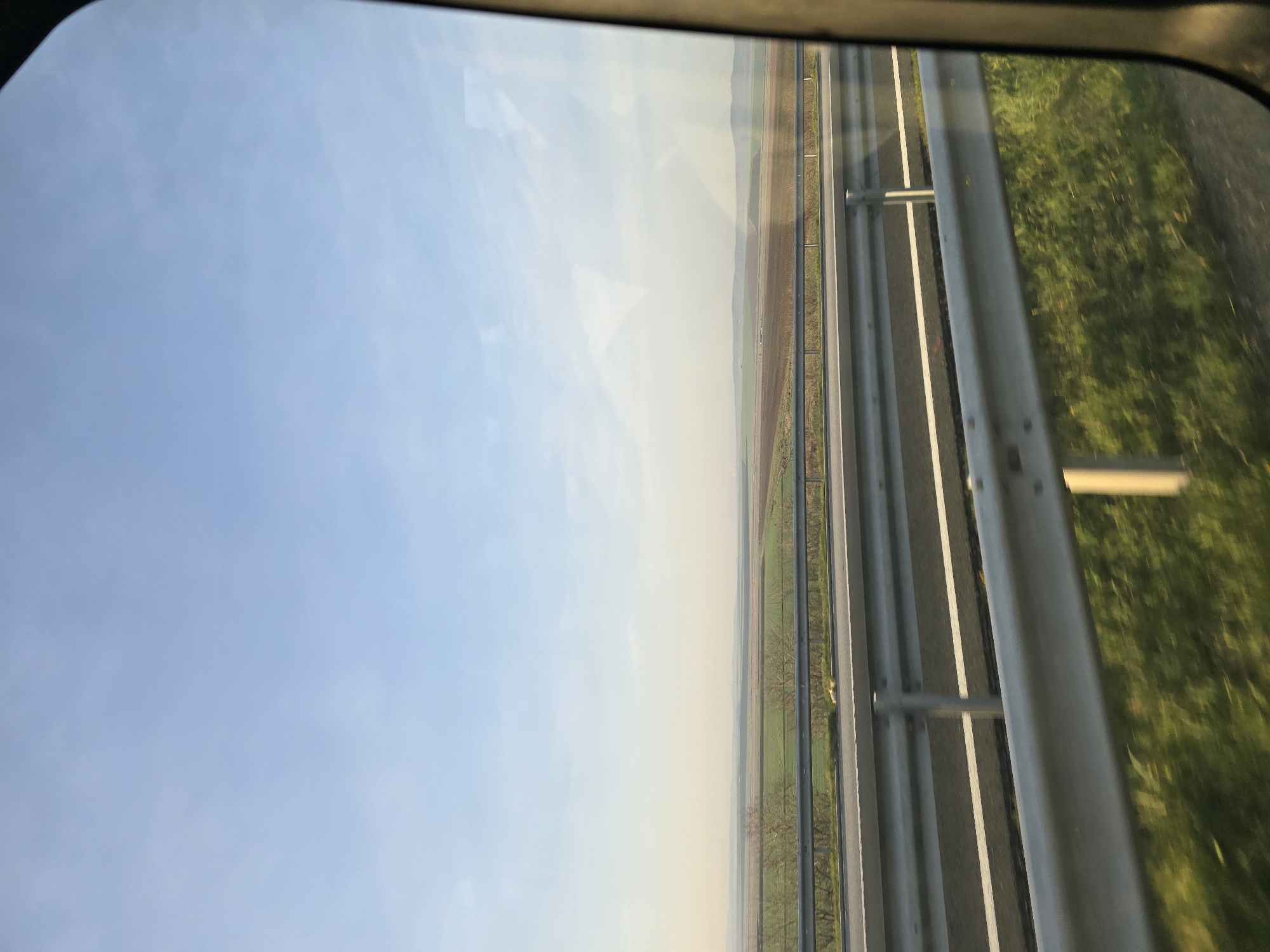 A vertical photographic image captured from inside a moving vehicle displays a highway and rural landscape near Polsko Padarevo, Bulgaria