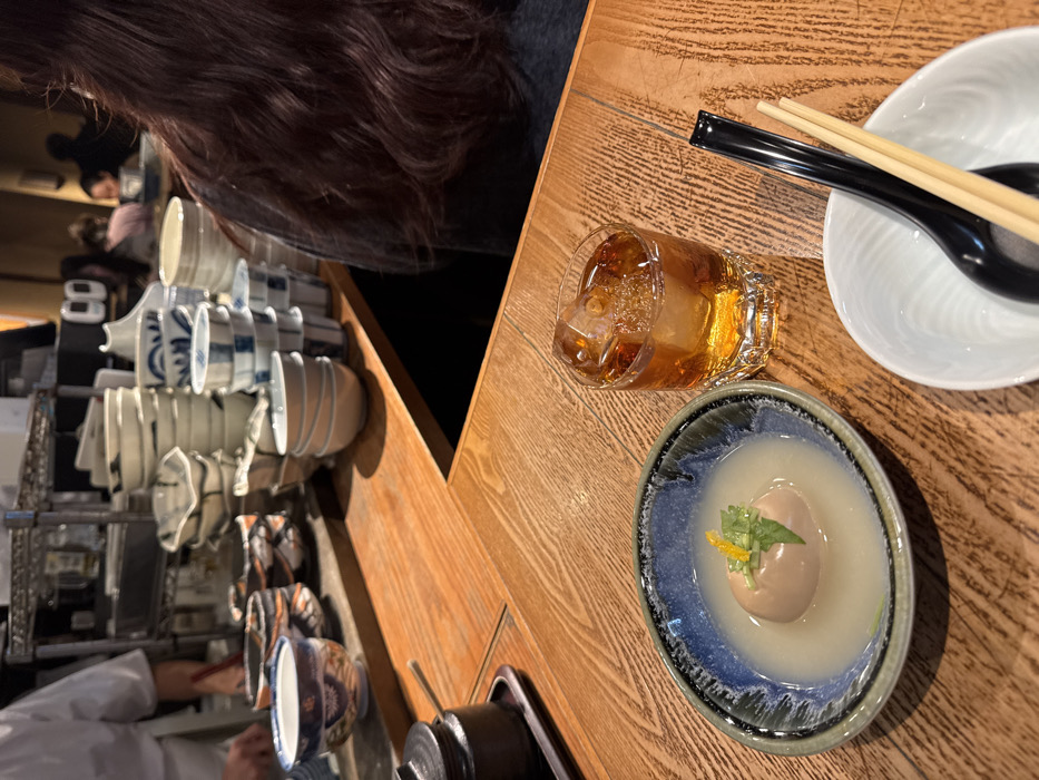 The image depicts an indoor scene within a restaurant in Meguro, Japan, viewed from a patron's perspective at a counter. In the foreground, a light-colored wooden countertop displays several items. On the left, a dark ceramic lidded container with a small stirrer rests on a dark tray. Center-left, a ceramic bowl with a blue rim contains a light-colored liquid and a smooth, ovoid, light-brown object garnished with an orange zest strip and green herb. To its right, a clear faceted glass holds an amber-colored beverage with several large, irregular ice cubes. Further right, an empty white ceramic bowl contains a black ceramic spoon and a pair of light-colored wooden chopsticks. The midground features an extended wooden counter surface. Along this surface, numerous stacks of assorted clean ceramic bowls are arranged, including patterns of blue and white, black and orange, and plain white, suggesting kitchen preparation or service readiness. A person, presumably a chef, wearing a white uniform, is partially visible on the far left, engaged in activity near a bowl. In the right midground, a person with long, wavy, dark reddish-brown hair is seated at the counter, facing away from the camera. The background is blurred, showing additional patrons seated further back in the warmly lit restaurant interior and hints of kitchen equipment.