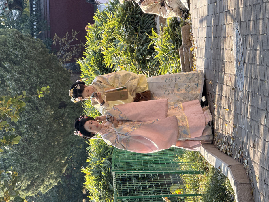 The image displays an outdoor scene in Xicheng District, China, featuring three individuals on a paved walkway alongside dense green foliage under direct sunlight. Two females in elaborate traditional Chinese attire are central. The female on the left wears a pink and light blue patterned robe, a hair bun adorned with pink flowers, and holds a smartphone in her left hand, facing forward. The female on the right wears a light yellow and white patterned robe, a hair bun decorated with gold and pearl-like ornaments, and is drinking from a dark cup held in her right hand. Her left arm supports a small brown paper bag with a green logo, and a small brown bag is slung over her left shoulder. To their left, a green metal fence separates the walkway from a bushy area. The paved path, constructed of interlocking grey pavers, is strewn with scattered dry leaves and features a circular metal manhole cover. In the background, large trees and additional green foliage are present, along with a section of a traditional red-walled building topped with a dark tiled roof and covered in climbing vegetation on the far right. A third individual, partially visible on the far right, is seated or kneeling on the ground, dressed in cream-colored traditional attire.