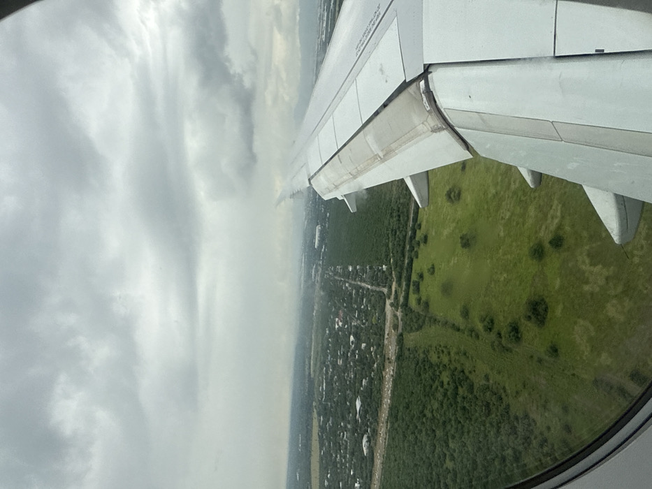 This aerial image, captured from the window of an aircraft, depicts a landscape within the city of Pesquería, Nuevo León, Mexico, under overcast skies. The right wing of the aircraft, with deployed flaps indicating descent or ascent, occupies the mid-right portion of the frame. The sky above is entirely covered by dense, grey clouds, suggesting low visibility or impending precipitation. Below the aircraft, the terrain consists of a mixture of natural and developed areas. In the foreground and midground, large sections of dense green vegetation are visible, bordering expansive open grassy fields with scattered individual trees. A prominent straight road or dirt path runs horizontally across the midground, separating different types of land use. To the far left, a discernible residential area is present, characterized by numerous small buildings and a grid of roads, partially obscured by the distant haze. Further in the background, towards the center-right, indistinct structures or urbanized zones are visible through atmospheric haze, suggesting industrial or commercial development. Faint outlines of mountains rise on the distant right horizon. No individuals or specific actions beyond the aircraft's flight are discernible.