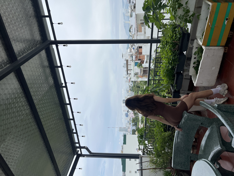 A female subject with long brown hair, wearing a brown short-sleeved romper, white socks, and light-colored athletic shoes, is seated sideways on a green-speckled concrete bench on a rooftop or elevated balcony. She is positioned with her back to the camera, looking out over the city. The immediate foreground features an orange-red tiled floor, a matching green-speckled concrete table and chairs, and numerous potted plants in rectangular black and white containers along the railing. Overhead, a black metal pergola structure with a patterned grey roof supports a string of exposed filament light bulbs. The background reveals a dense urban panorama of Nha Trang, Vietnam, with a multitude of multi-story buildings, scattered greenery, and a prominent tall tower in the distance. Distant mountains are faintly visible on the far right horizon beneath an overcast sky.