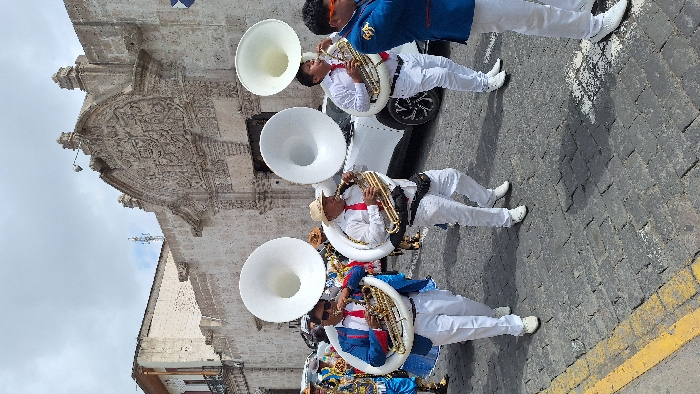 A street band parades on a cobblestone road. Several men wearing white pants and colorful jackets play large tubas. An ornate stone building with detailed carvings sits in the background under a cloudy sky. A white car is visible behind the band members. The musicians are lined up and moving in the same direction, creating a festive atmosphere in an urban setting.