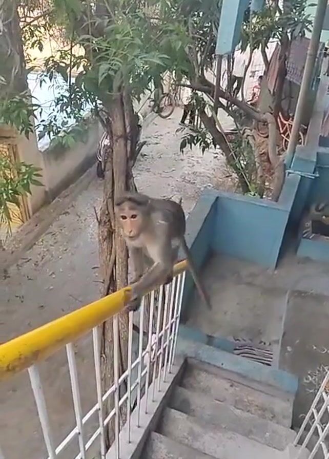 monkey walking on a yellow railing. The monkey is light gray in color and is walking from left to right in the video. The railing is part of a set of stairs that lead up to a building. There are trees and foliage visible in the background. There appears to be a person filming the monkey from an upper-level vantage point.