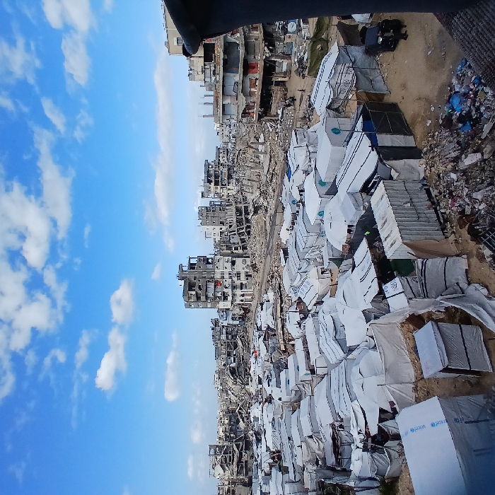- "The image depicts an aerial view of a densely packed tent encampment situated amidst heavily damaged urban infrastructure in the city of Gaza, Palestinian Territory" by FM-lJnzj1, licensed under CC BY 4.0