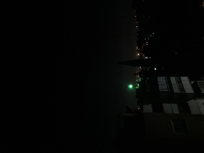 The image depicts a nighttime urban landscape in Barza Municipality, Syria. The sky is dark and clear. In the lower-left portion, the upper floors of a multi-story building, featuring visible windows and balconies, are partially discernible. A prominent, intensely glowing green light source is situated in the midground, appearing atop a distant structure. To the right of this green light, a tall, dark, spire-like edifice is silhouetted against the night sky. The background reveals a sprawling pattern of scattered, faint yellowish-orange city lights, indicative of an expansive urban area. Dark, undefined silhouettes of vegetation are interspersed throughout the midground. No individuals or specific actions are observed.