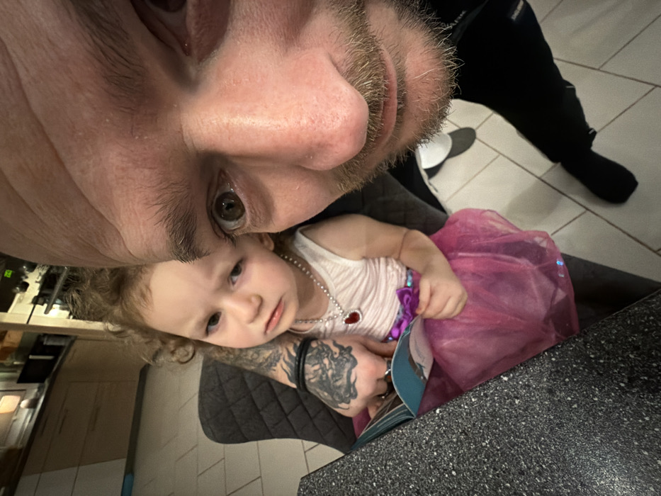 A man poses closely with a young child wearing a pink tutu and a heart necklace. The man has a beard and visible eyebrow hair. He is looking at the camera. The child is also looking at the camera with a mildly displeased expression, holding a book. The scene is indoors, and a kitchen area is partially visible in the background. The man has a tattoo on his left arm. The picture is taken at an angle, with the man's face dominating the upper portion.
