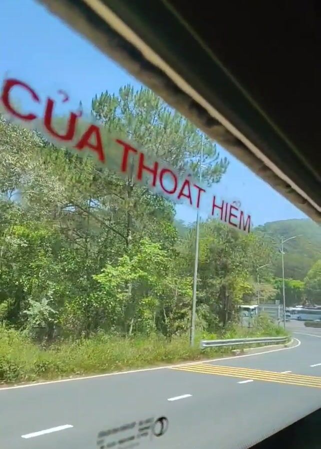 From inside a moving vehicle, possibly a bus, the view out the window shows a winding road with yellow lines painted across it. "CUA THOAT HIEM" is printed in red on the window. The surrounding environment includes trees, green vegetation, and a hilly landscape in the distance. Several vehicles, including a small orange truck and some larger buses, can be seen on the road.