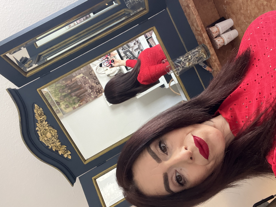 The image captures a selfie taken by a woman indoors in Konz, Germany. The woman has long, dark brown hair and is wearing a red high-neck top with an eyelet pattern. She is looking directly towards the camera, which is positioned to capture her reflection in a large, ornate triple-panel mirror. Her lips are painted with red lipstick. The mirror features a dark blue frame with gold trim and elaborate gold scrollwork at its top center. In the reflection, the woman is seen from behind, holding a white smartphone with a colorful (possibly pink and black) case in her right hand. The reflection also shows a painting with a landscape or tree motif and circular patterns on a white wall. Below the central mirror, a clear cut-glass vase containing internal lights and two white cosmetic bottles with light brown caps are resting on a mottled, light brown polished surface, possibly a vanity or dressing table. A light-colored handbag is also partially visible in the reflection, positioned behind the woman's reflected figure.