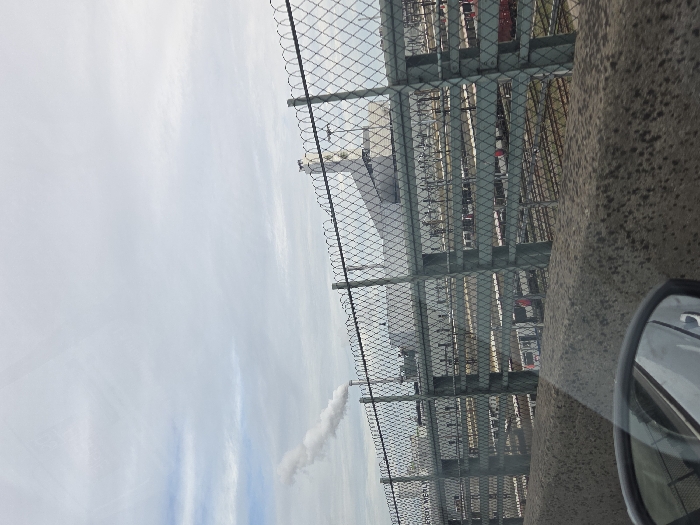 The image presents an industrial landscape under an overcast sky, viewed from an elevated position. In the foreground, the upper portion of a dark grey, textured concrete barrier is visible, extending horizontally across the lower third of the frame. In the bottom-left corner, a black-framed vehicle side mirror reflects a partial view of a grey surface and a fence. A chain-link fence, topped with single-strand barbed wire, forms a prominent midground element, spanning the width of the image. It is supported by dark grey-green metal posts. Beyond the fence, a large railway yard is visible, featuring numerous parallel tracks. Several trains or train cars, some predominantly red and others white/grey, are positioned on these tracks. In the far background, large industrial buildings with light-colored facades are present. One building exhibits a tall, slender stack from which a distinct plume of white smoke or steam ascends into the sky. Partially visible text on one of these buildings appears to read "ENERGY" or "ENGIE" followed by obscured characters, possibly "MERL" or "MEUL". The sky occupies the upper two-thirds of the image, characterized by light grey cloud cover with subtle hints of lighter blue. No individuals are visible. This scene is located in the industrial area surrounding the **Engie thermal power plant in Ivry-sur-Seine, Paris, France**, likely observed from an elevated roadway or bridge, such as the **Boulevard Périphérique or a nearby highway**, overlooking the plant and its extensive adjacent railway infrastructure.