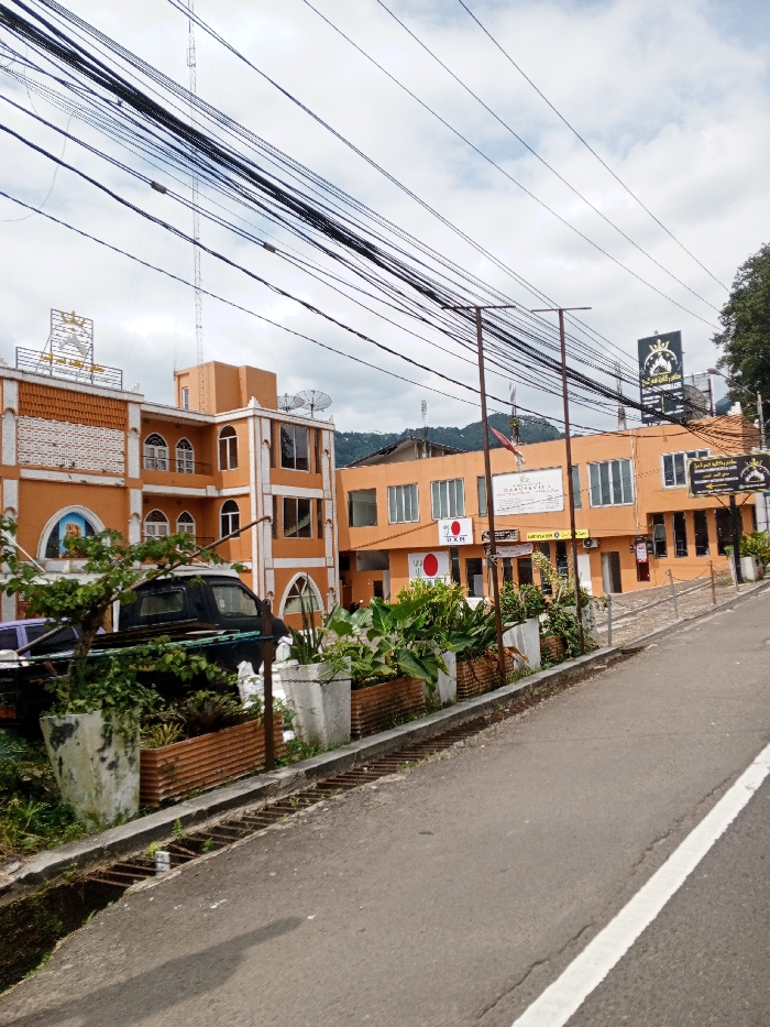 The image depicts a static street scene in Cisarua, Indonesia, captured from a slightly elevated, upward-sloping perspective. The foreground features a gray asphalt road with a solid white line marking its right edge. A concrete curb on the left separates the road from a drainage ditch with a metal grate, beyond which lies a row of planters. These planters consist of both weathered concrete pots and corrugated metal boxes, holding various green plants and small trees. A dark-colored pickup truck is partially visible behind the leftmost planters. On the left side of the street, a series of multi-story buildings, predominantly painted orange with white trim, line the road. The leftmost structure is a multi-story building characterized by arched windows, decorative wall panels, and a prominent rooftop sign featuring a crown motif and Arabic script. Several satellite dishes are affixed to its exterior, and a tall, slender antenna rises behind it. Adjacent to this, a central orange building displays rectangular windows and features signs for "DARUVILLA" and "DXN," the latter depicted as a red circle with white text. Further right, a lower orange building also presents large windows and another sign with a crown motif and Arabic script. Overhead, a dense entanglement of black utility wires crisscrosses the sky, supported by multiple poles positioned along the street. The background reveals lush green hills beneath a partly cloudy sky. No individuals or discernible actions are present within the frame.
