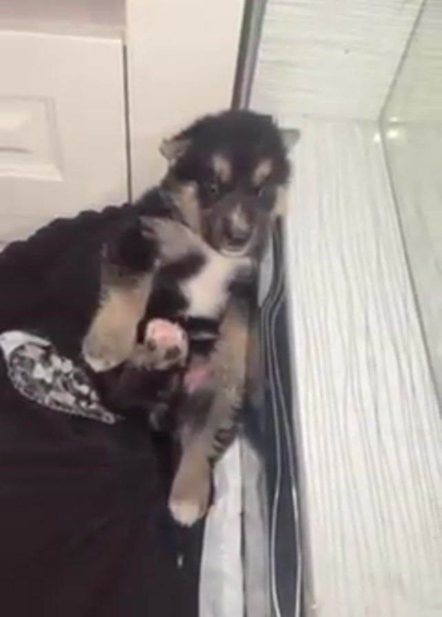 A person holding a puppy is standing in front of a mirror, which reflects the puppy’s image. The puppy has black and tan fur and is squirming. The person holding the puppy is wearing a black shirt. The background includes a white door and striped wall covering.