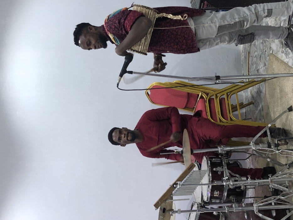 An indoor scene in Gbawe, Ghana, depicts two adult males performing music against a plain white wall and light-colored floor