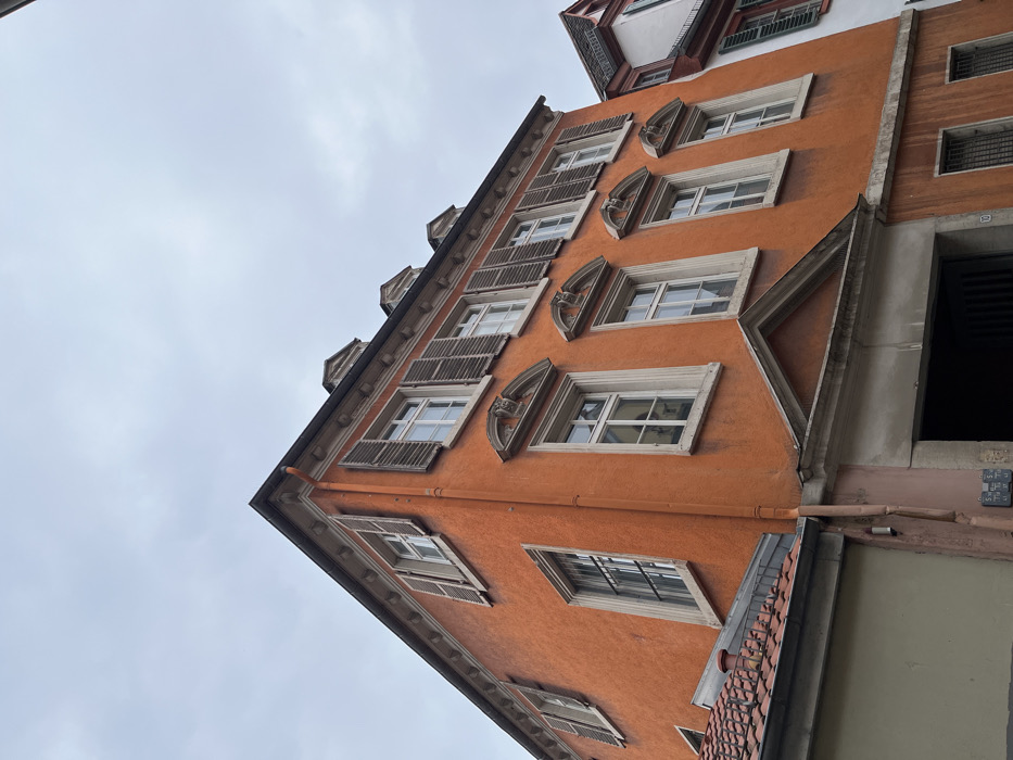 The image displays the exterior of a multi-story building in Heidelberg, Germany, presented from a low-angle perspective looking upwards towards an overcast, light grey sky. The prominent structure is a corner building with walls colored in a textured, deep orange or terracotta hue. The main facade, oriented towards the viewer, features a total of seven windows visible across its upper two levels. The four windows on the lower of these two levels are rectangular, framed in white, contain multiple panes, and are adorned with ornate white moldings, including arched pediments above and sills below. Each of these four windows is equipped with dark brown or grey wooden shutters, which are open and folded back against the wall. The three windows on the uppermost level visible are similar in structure, also with white frames, multiple panes, and open dark shutters, but with simpler white sills. A decorative white cornice runs along the top of the main wall, below a pitched roof from which three dormer windows, each with a small triangular pediment, protrude. On the left-side facade of the orange building, one window on the lower visible level is fitted with dark metal security bars and lacks shutters. Above it, another window with open dark shutters is present. A vertical orange downspout runs down the corner of the building. At the ground level of the main facade, a large, dark, recessed opening, consistent with an entrance or garage, is prominent, capped by a light-colored, classical-style pediment. To the immediate right of this entrance, two smaller, ground-level windows with dark metal bars are visible. To the left of the main orange building, a portion of a lower, adjacent structure is visible, featuring a red tiled roof and a beige-green colored wall. To the right of the main orange building, part of another multi-story structure with white walls, dark green open shutters on its windows, and a tiled roof is discernible. No individuals, vehicles, or notable vegetation are present within the frame.