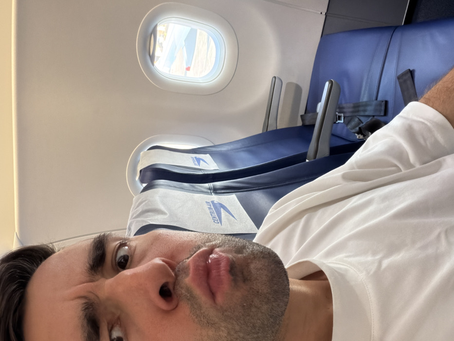 The image captures an adult male within a commercial aircraft, located in the city of Unknown, Israel