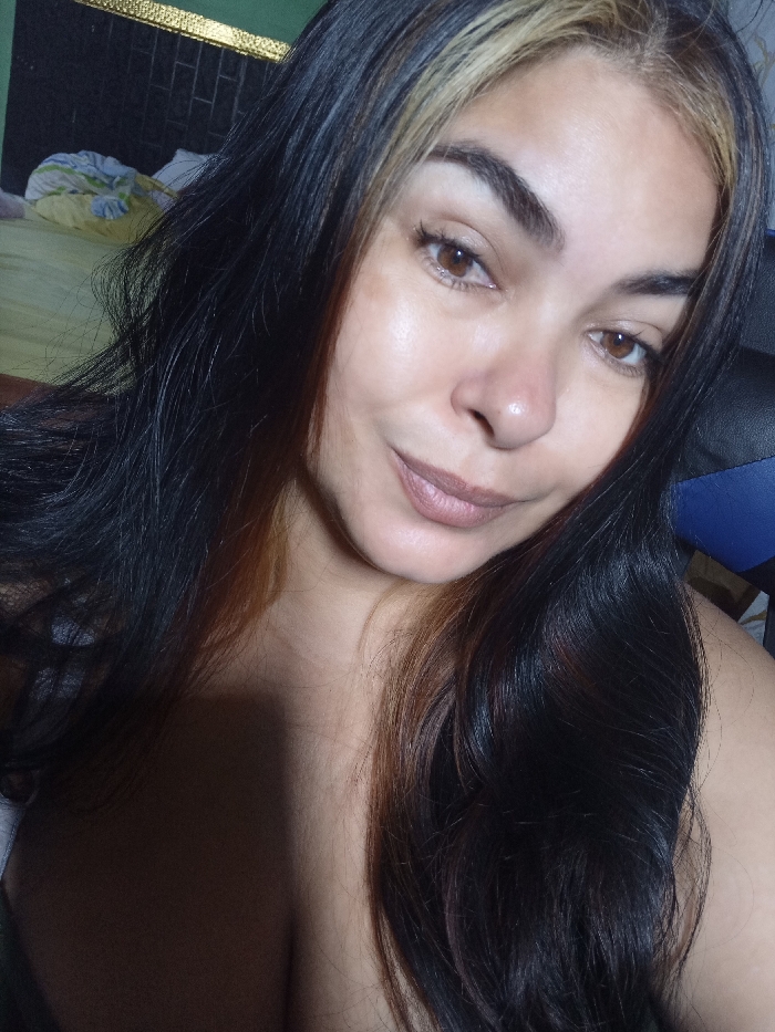 A woman gazes into the camera with a slight smile. She has brown eyes, fair skin, and dark hair with blonde highlights near her face. The lighting casts a shadow on her chest, highlighting her bare shoulders. The background is a bit blurry, showing a bed with patterned sheets and a dark headboard. The overall impression is intimate and casual.