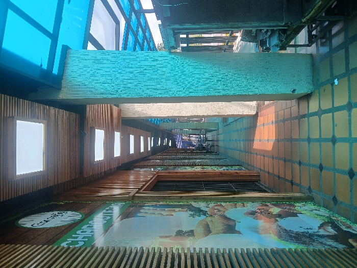 An indoor perspective looking down a long, narrow space. The ceiling is a mixture of turquoise panels and wooden beams. Windows line the left wall, and a tiled wall is on the right. Below, there are wooden walkways and a large print mural, partially obscured by slatted wooden panels. The overall effect is a diminishing view, creating depth and a sense of enclosed space.