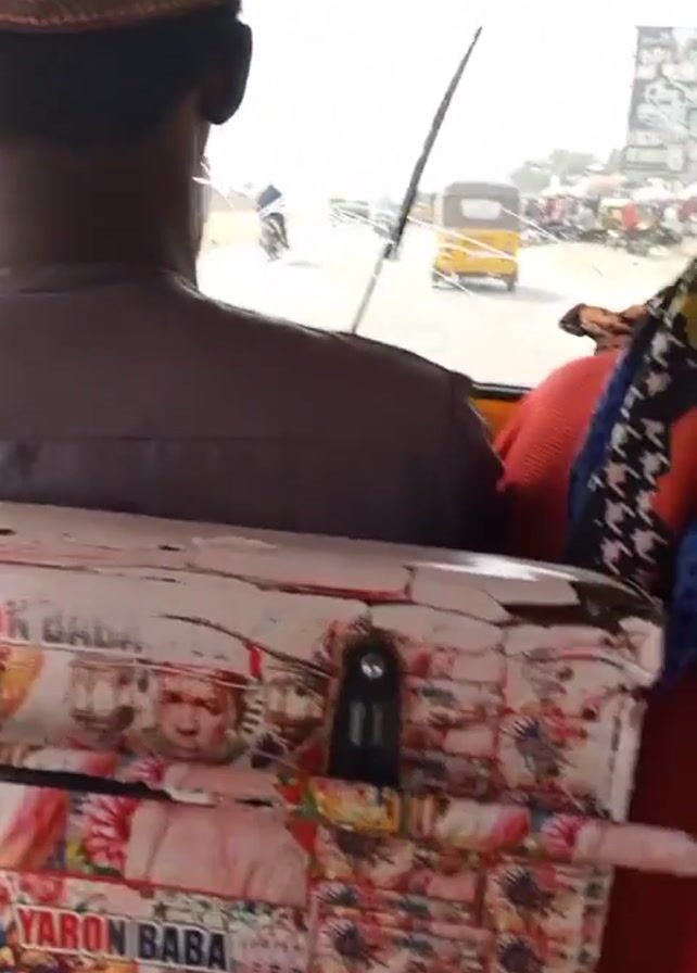 interior of a moving vehicle, likely a three-wheeled auto rickshaw, with two passengers visible