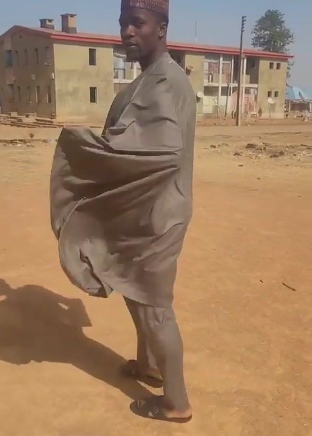 A man is posing for the camera in an outdoor setting. He is wearing a gray traditional outfit, including a long-sleeved top, pants, and a patterned cap. His top has a decorative V-shaped design on the chest area. He also sports black sandals. The ground is reddish-brown dirt or sand. In the background, there are buildings, with one being a two-story structure painted in light colors. The sky above is clear and blue. The man's shadow is cast on the ground in front of him. He is facing towards the right and then turns to look at the camera. A red vehicle can be seen in the background.