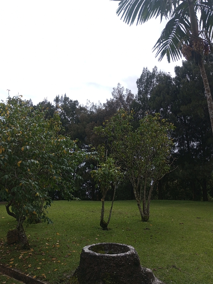 A verdant lawn stretches towards a dense backdrop of trees, some towering evergreens. Several small trees dot the landscape, along with a large, weathered stone structure in the foreground, possibly a well or fountain base. A palm tree frames the upper right corner, its fronds arching into the overcast sky. The scene evokes a serene, natural setting.
