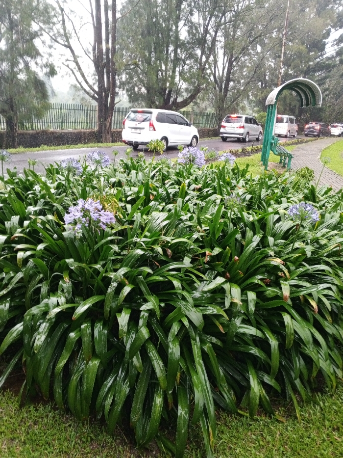 A vibrant green patch of agapanthus plants dominates the foreground, some adorned with blue flowers. Behind, a paved pathway and road host several parked or moving vehicles. A quaint covered bench is nestled beside the path. The scene is enveloped in a somewhat overcast atmosphere, with tall trees lining the background. A low stone wall with a metal fence sits along the roadside.