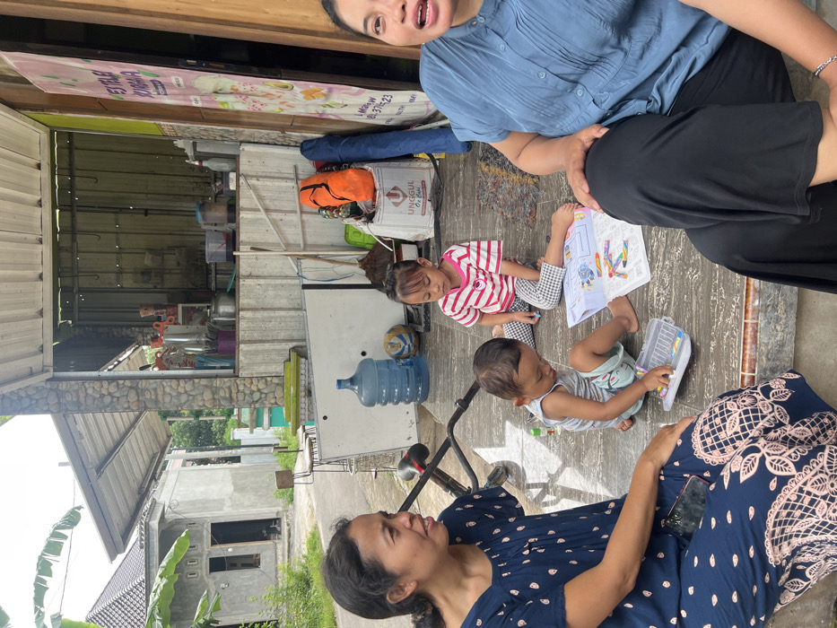 The image depicts an outdoor daytime scene on a paved terrace or porch area in Wedarijaksa, Indonesia. Four individuals are present: two adult women and two children. * The woman on the left, positioned in the lower-left quadrant, wears a dark blue patterned dress. Her dark hair is pulled back, and she is looking towards the right with a slight smile, appearing engaged in conversation. * The woman on the right, partially visible in the lower-right quadrant, wears a light blue collared shirt and black trousers. Her mouth is open, suggesting she is speaking or reacting. * A young boy, likely a toddler, sits barefoot in the lower-center. He wears a light-colored sleeveless top and shorts. He is focused on a clear plastic container filled with crayons and an open coloring book on the ground. * An older girl sits barefoot to the right of the boy, wearing a red and white striped t-shirt and patterned dark and light checkered pants. She is looking towards the left. Numerous objects are distributed across the scene: * On the terrace, near the individuals, are a black bicycle frame (partially visible behind the left woman), a large clear blue water dispenser bottle, a deflated volleyball, and a white rectangular panel (possibly a tabletop). * Further back on the terrace, stored against a wall, are a white bag branded "UNGGUL," an orange inflatable object, and a blue rolled mat. * The background on the right features a commercial or semi-commercial structure with a corrugated metal roof and stone-clad pillars. A counter beneath this structure holds various kitchen items, including metal pots, plastic containers, and a blender or juicer. A tall, vertical pink banner advertising "ES TELEK JOMBAYA" with additional text and a phone number (081 378 23) is affixed to a wooden doorframe on the far right. * The background on the left shows a narrow concrete road or pathway, beyond which are two simple, unpainted concrete houses with tiled roofs and some green foliage, including a banana plant. The overall environment suggests a casual, domestic, or roadside vendor setting under bright, possibly overcast, daytime lighting. The adults appear to be socializing while the children are occupied with drawing.