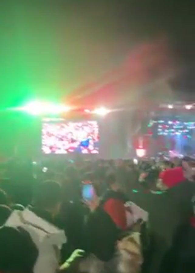 large crowd of people gathered at a concert at night. There's a stage with a large screen displaying visuals, and bright lights flashing across the crowd. The people in the crowd are mostly facing the stage, many holding up their phones, possibly recording or taking pictures. Some people are waving their arms in the air, appearing excited and engaged. The overall atmosphere suggests a lively and festive event.
