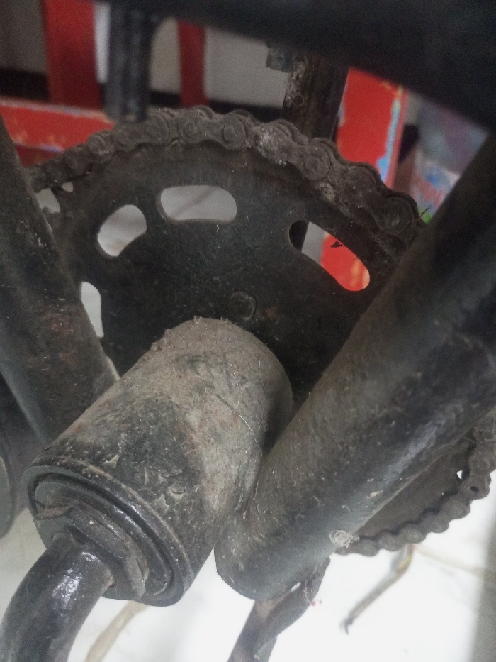 A close-up view of the lower drivetrain components of a bicycle, situated in Zee Pin Kone, Myanmar