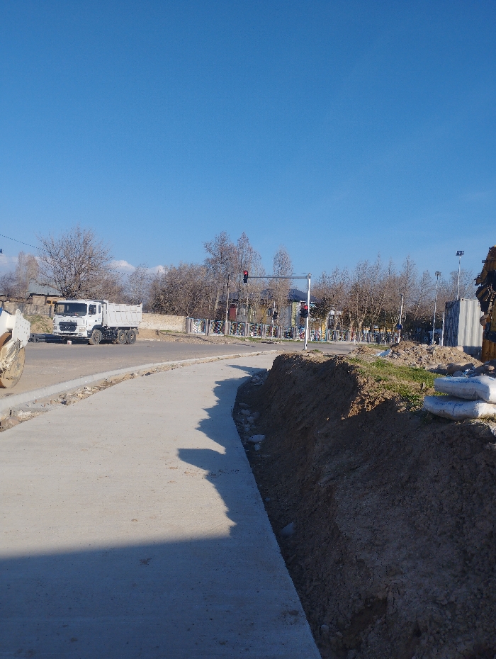 This image captures a daytime scene in Chirchik, Uzbekistan, under a clear, cloudless blue sky. In the immediate foreground, a concrete sidewalk, appearing newly constructed or under completion, extends from the lower left towards the center. A prominent dark shadow, consistent with a person or object located to the immediate left of the frame, is cast across the lower left portion of this sidewalk. To the right of the sidewalk, a raised earth bank, indicative of excavation or construction, runs parallel to the concrete. Multiple white sacks, consistent with construction materials, are stacked on this earth bank near the right edge of the frame. In the midground, a paved road curves from the left towards the background. A white dump truck is positioned on the left side of this road, facing away from the viewer. Its front left wheel is partially visible on the far left. The background features an intersection with an overhead gantry supporting a traffic light, which displays a red signal. Beyond the intersection, numerous deciduous trees, devoid of foliage, are visible, suggesting a winter or early spring season. Utility poles and lines are present throughout the background. On the far right, portions of a yellow construction vehicle and a grey metal container are visible. No people are discernible within the frame. The overall scene indicates ongoing road or infrastructure construction.