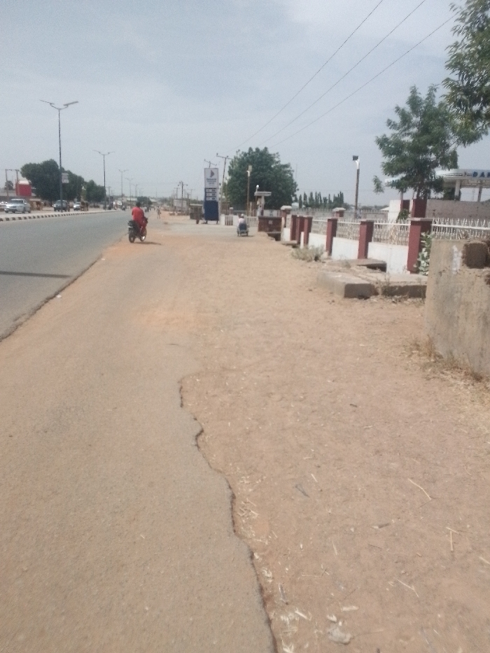 This image captures a daytime street scene on a road approaching Muhammadu Dikko Stadium in Katsina, Nigeria, under a hazy or overcast sky