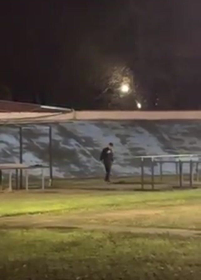 At night, a person in dark clothing walks across a grassy area