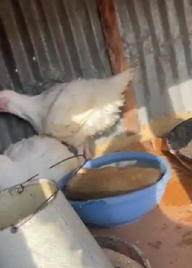 Inside a small, dimly lit chicken coop, two white chickens are seen