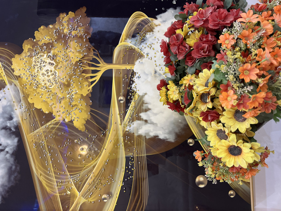 A vibrant floral arrangement dominates the right side, featuring sunflowers, red roses, and orange daisies. The left side showcases an abstract gold tree-like structure embellished with silver beads. Golden ribbons intertwine throughout the composition, accentuated by floating golden bubbles. A smoky cloud effect is present, creating a dreamlike and surreal atmosphere against a dark, abstract backdrop.