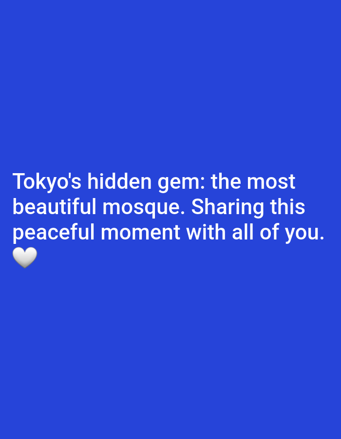 The image displays a solid royal blue background. White text is centrally positioned on the lower half, reading: "Tokyo's hidden gem: the most beautiful mosque. Sharing this peaceful moment with all of you." A white heart emoji is located directly below the text on the left side. No other subjects, objects, people, actions, or environmental features are depicted. Based on the textual reference to "Tokyo's most beautiful mosque," the implied location is Tokyo Camii, situated in Yoyogi Uehara, Shibuya City, Tokyo, Japan.