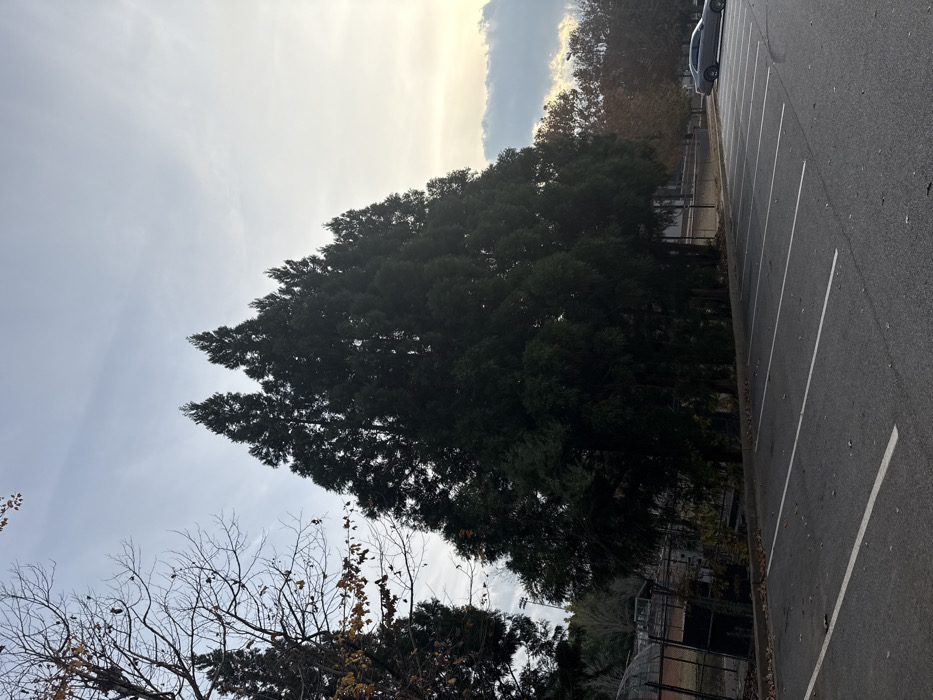 A parking lot adjoins a dense tree line beneath a cloudy sky. The trees, predominantly evergreen, rise high, casting shadows over the adjacent lot. A lone silver car is parked at the edge of the frame. In the foreground, bare branches of deciduous trees reach upward, contrasting with the dense greenery behind. A fence-enclosed area is situated between the trees and the parking lot.