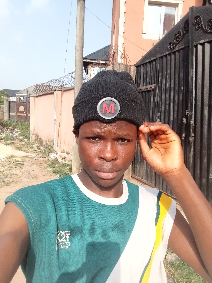A young person with dark hair wears a black beanie with a red "M" emblem. He has dark skin and wears a sleeveless green and white shirt. The background shows a partially overcast sky, buildings, a metal gate, and a concrete fence with barbed wire. The person looks directly at the camera with a neutral expression. They have one hand near their face, possibly adjusting the beanie.