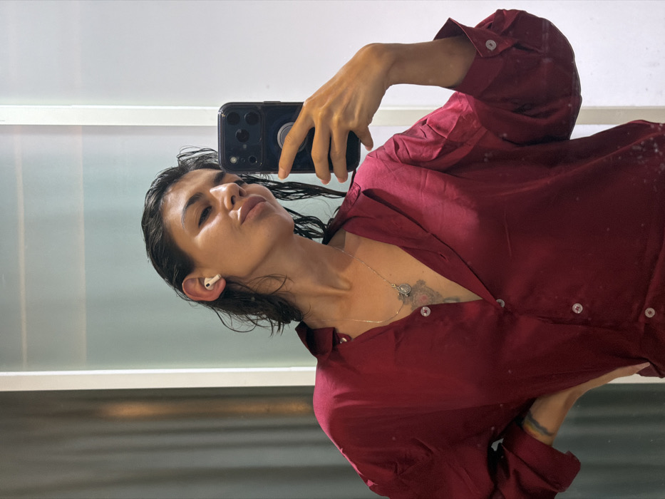 One adult female subject is depicted in a waist-up mirror selfie. Her dark hair appears wet and is styled away from her face. She is wearing a loose-fitting, maroon-colored collared shirt, unbuttoned to mid-chest, revealing a silver necklace with two pendants and a dark-colored tattoo below her left clavicle. A white wireless earbud is inserted into her right ear. Her right hand holds a black smartphone, featuring a multi-lens camera array and a circular grip device on its back, positioned to capture the reflection. Her left forearm displays a faint, multi-colored tattoo, and her left hand is placed on her hip. The subject's facial expression features pouted lips. The immediate environment reflected in the mirror consists of a light-colored wall or surface, with a vertical light fixture positioned to the right of the subject's reflection. The specific location within Nusa Dua, Indonesia, cannot be determined from the visual information presented in the image.