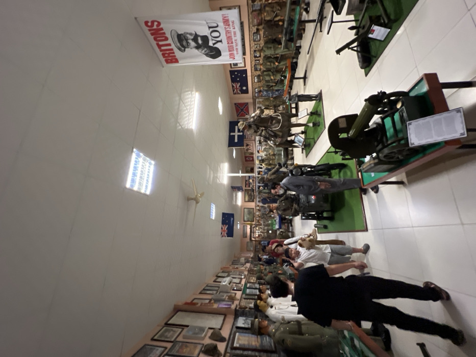 A museum displays historical military artifacts. Mannequins dressed in old military uniforms stand among displays of antique firearms, weaponry, and flags from various nations. People stroll along the tiled floor, observing the exhibits. Above hangs a "Britons Join Your Country's Army" poster. The setting is brightly lit by ceiling lights and has a fan in the background.