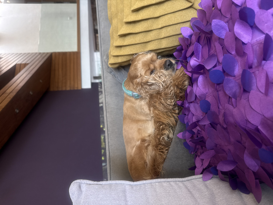 A golden cocker spaniel sleeps soundly on a grey couch, nestled between a purple leafy pillow and a mustard yellow pillow. The dog wears a light blue collar. Part of a wooden bench and wall can be seen to the left, with a purple floor beneath. The lighting is bright, casting soft shadows. The scene is peaceful and cozy.