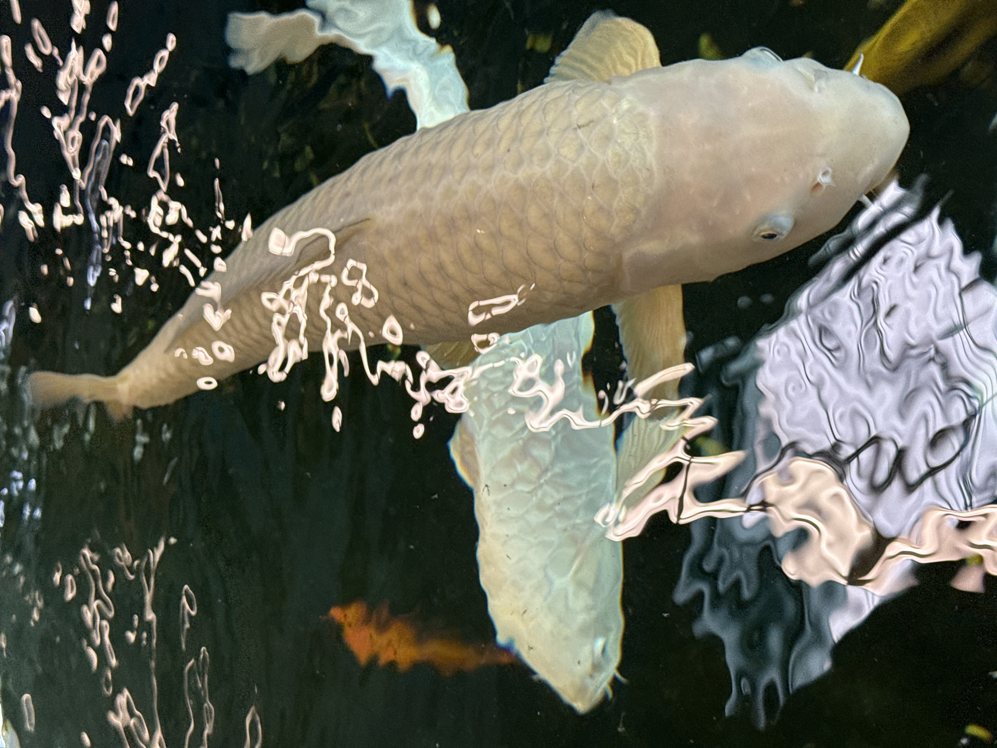 The scene, located in Geispolsheim, France, captures an overhead view into a body of water, likely a pond or tank. A large, pale, cream-colored koi fish (Cyprinus rubrofuscus) dominates the foreground, swimming diagonally from the upper center towards the lower right of the frame. Its head, body, and distinct scales are clearly visible. A second, similarly pale koi fish is partially visible beneath and to the left of the primary fish, swimming in the same general direction. In the upper-left background, an orange-colored fish is partially observed, appearing somewhat blurred. The water's surface is characterized by dynamic ripples and reflections, creating numerous elongated, bright white and light gray abstract patterns that distort the view into the water. The surrounding water appears dark, suggesting depth.