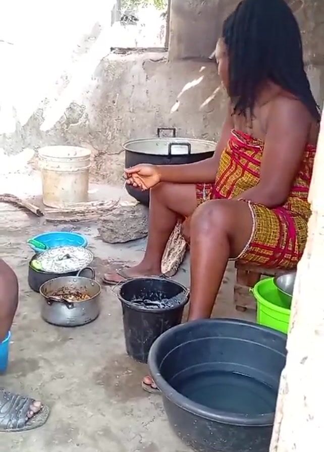 A woman is sitting on a stool, using a spoon to examine something in her hand. She has dark skin and dreadlocks pulled into a ponytail, and is wearing a colorful patterned wrap dress. Next to her on the ground is a large black tub filled with water and other small containers, as well as a green bucket. Behind her, a large cooking pot sits atop a fireplace, and the walls around her are made of concrete. There is a window in the wall behind the fireplace, allowing light to shine through. To the left, a person is sitting on the ground, sifting through food from a bowl into a pot. They are holding a cell phone in their other hand. They have dark skin and are wearing sandals. The environment appears to be outdoors, but sheltered.